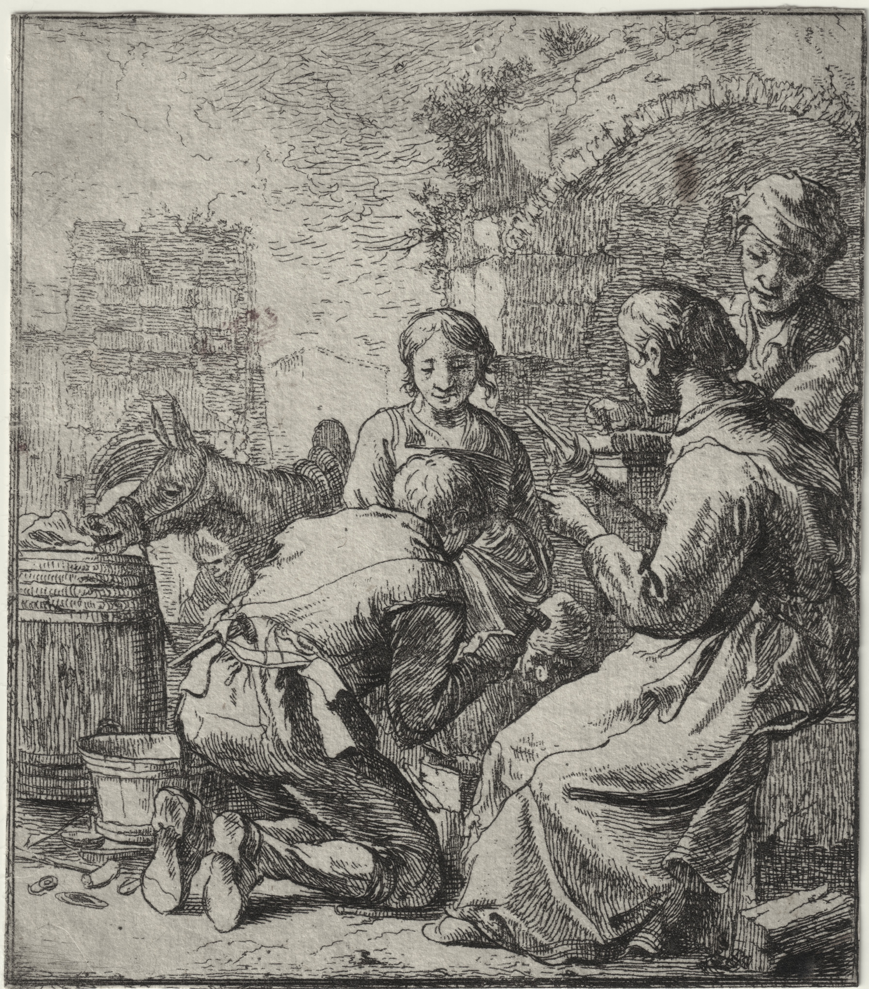 Sans filigrane ni marque de collection; excellente impression contemporaine sur papier vergé, coupée à l’image, manque de la partie inférieure où se trouve la signature, quelques taches, effet de ton, barbe dans l’angle inférieur droit. Le titre indiqué par le Rijksmuseum est plus descriptif: « Vier figuren bij een vervallen gebouw » (Quatre personnages devant une maison en ruine). Thomas Wijck, élève du Bamboche, a fait une copie inversée de cette estampe (« La fileuse et le forgeron« ).