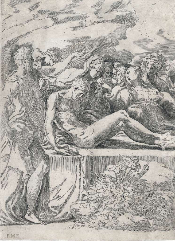 Excellente impression contrastée, très claire, du second état de cette importante gravure, coupée à la limite de la cuvette, manque restauré d’1,5 cm dans la partie supérieure. Incription « F.M.F. » (Francesco Mazzola Fecit?) en bas à gauche, sans doute à l’encre. Il s’agit de la seconde version de ce sujet gravé par Parmigianino, la planche de la première version ayant été endommagée par l’acide. Mistrali remarque que les impressions du second état sont plus rares que celles du premier état de cette seconde version – une gravure qui représente le sommet de l’art du Parmesan.