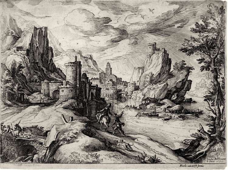 Le titre donné par le British Museum à la série à laquelle ce paysage appartient identifie un lieu: « Views of the Coast of Campania ». A propos de ce paysage en particulier, le British Museum ajoute le commentaire suivant: « This etching follows the composition (in the same direction) of Bril’s fresco on a lunette of the loggia in the courtyard of the Lateran Palace in Rome, which was painted in 1588-89. It seems to be the only one of Bril’s prints that relates to a fresco. See Carla Hendrick, Northern landscapes on Roman walls: the frescoes of Matthijs and Paul Bril, Florence, 2003, p. 47. »
