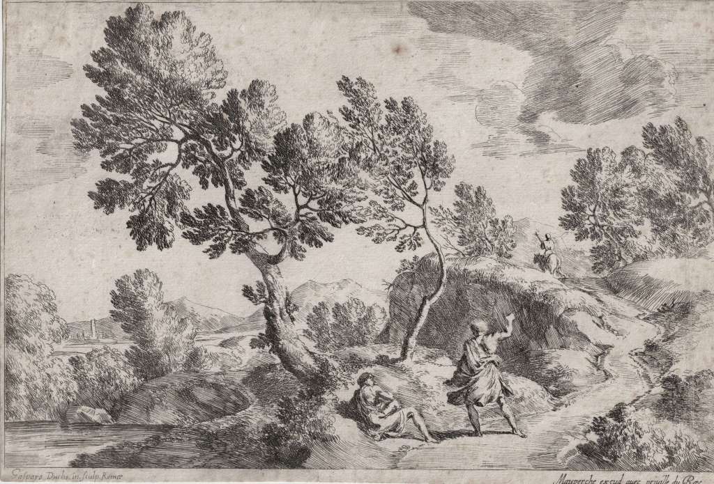 Imaginons donc. L’estampe, bien sûr, a voyagé, elle a parcouru l’Europe. Le jeune Ruisdael médite la proposition de Dughet. Il en offre une interprétation dans les lumières et sous le ciel de Harlem. La traduction passe d’un paysage à l’autre: ce chemin qui serpente, cette montée qui met le marcheur à la peine, ces branches qui dansent et divisent l’espace (à gauche, au loin, les toits de la ville que l’on devine et que trahit la verticalité d’un clocher; à droite, la route qui monte au ciel, vers le nuage), et ce nuage – ce monument de nuage – qui a fait la célébrité du tableau de Ruisdael et qui est déjà là, lourd, massif, menaçant dans l’eau-forte du Gaspre. Tout est là mais tout est transformé, renversé, les matières sont refondues dans quelque chose d’autre, la lumière devient tourment, l’Arcadie n’est plus.