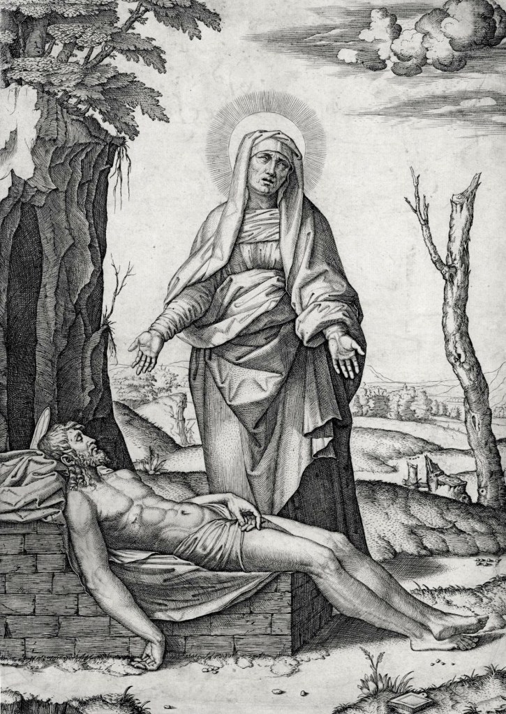 In his second version of The Pietà, Marcantonio created a more evocative and explicit image of suffering, by substituting a haggard woman, stricken with grief, for the youthful Madonna of the earlier version, and by adding the wound on a now less generalized, more human representation of the dead Christ. Marcantonio further intensified the pathos of the composition by adding the gaunt tree to the right, which not only underscores the mood of The Pietà, but also serves to restrict and frame the composition in a balanced and more severely planar format. The background landscape, stripped of its delicate, atmospheric qualities and its genre details, functions as an expressive void against which the grieving Madonna stands in stark relief. From the first version, only the rocky tomb, derived from Lucas van Leyden’s Madonna of the Desert (B.VII,123) remains unchanged. The transformation of The Pietà into a more monumental, austere, and rigidilly organized composition is consistent with Marcantonio’s development during his mature Roman period. (…) In this mature work, both style and technique are harmoniously united in creating one of the most compelling images of Marcantonio’s oeuvre. (The Pietà was one of Marcantonio’s most popular compositions. Copies or versions of it were made by Giulio Bonasone and Jerome Wierix. An altarpiece by l’Ortolano in the Museo Nazionale, Modena is also based on the engraving.